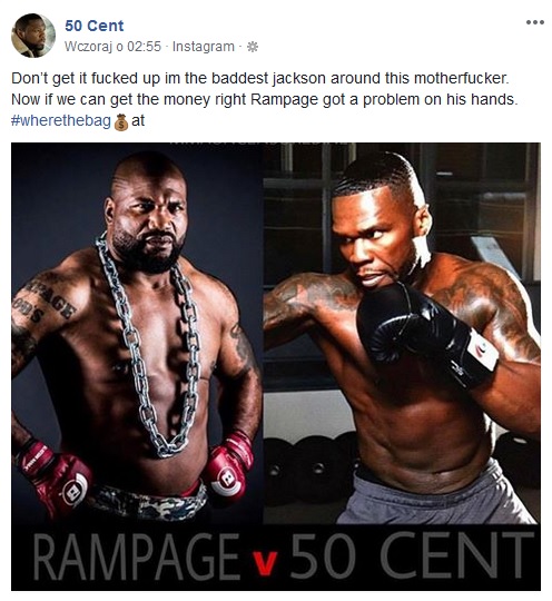 Kilka dni później 50 Cent opublikował wpis, w którym właśnie wyzwał na pojedynek byłego mistrza UFC. Stwierdził, że to on jest najgroźniejszym z Jacksonów i jeśli otrzyma odpowiednią propozycję finansową, „Rampage” znajdzie w opałach: