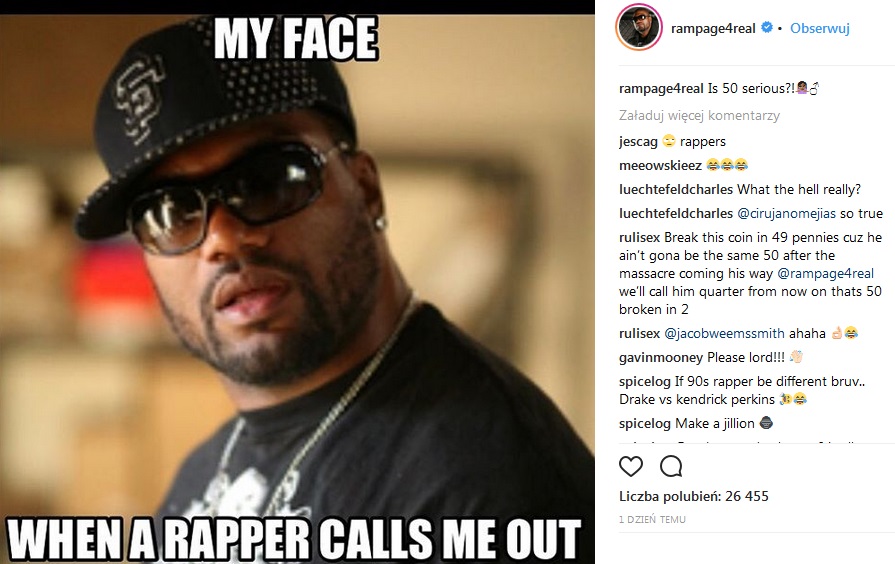 Na odpowiedź jednak nie musiał długo czekać, popularny „Rampage” zamieścił na Instagramie zdjęcie swoje zdziwionej twarzy z podpisem „kiedy raper wywołuje moje imię”: