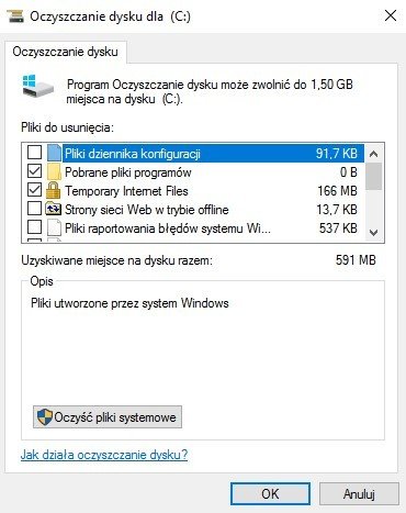 System i programy podczas pracy tworzą pliki tymczasowe, które potem stają się niepotrzebne. Niektóre usuwają się automatycznie, ale spora ich część pozostaje nietknięta i w efekcie spowalnia nasz system (np. tymczasowe pliki internetowe, pliki raportu błędów, zawartość kosza, dzienniki instalatora etc.) Warto skorzystać z systemowego narzędzia Oczyszczanie dysku, lub dedykowanego oprogramowania np. CCleaner