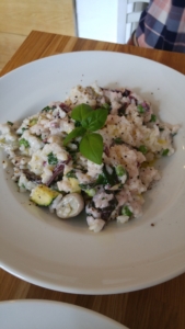 Na obiad udałam się do wegańskiej kawiarni „The Root”. Szczerze mówiąc nie jestem zachwycona tym miejscem. Opinie na stronach są rewelacyjne , ale mi się tak wcale nie wydało. Wnętrze są bardzo ładne, natomiast to, co zamówiłam było kompletną porażką. Chciało czegoś czego wcześniej nie próbowałam, więc wzięłam „Risotto Primavera” w wersji roślinnej. Któż by wiedział , że ryż i różne warzywa będą przygotowane na mleku kokosowym. Mogę czegoś nie rozumieć, ale tego nie dało się jeść. Jak dla mnie bób, cukinia i groszek w mleku kokosowym są to niepołączalne składniki. Jedyne co było smaczne to smoothy , ale i tak sama takie w domu robię ( banan + pomarańcza + kakao+ daktyle+ mleko ryżowe/sojowe). Jest to bardzo zdrowy deser – polecam.