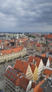 Udałam się na wieżę kościoła św. Elżbety na starówce. Nie róbcie tego jeżli macie klaustrafobię. Aby dotrzec do tarasu widokowego, trzeba przejść około 300 schodów. Korytaż jest skromy i bardzo ciasny. Uważam, że o takich rzeczach powino się informować na dole, przy wejściu. Jednak warto popatrzeć na panoramę miasta z 90-metrowej wieży. Bilet normaly kosztuje 5 zł., a dla dzieci poniżej 6 roku życia 1 zł. Istneję także kilka innych tarasów we Wrocławiu, ale niestety nie miałam zbyt wiele czasu aby je odwiedzić.