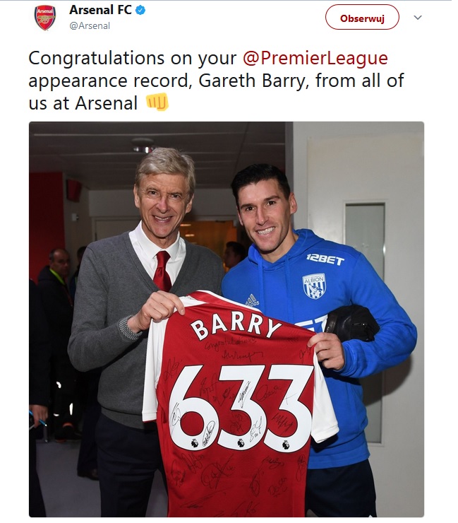 Gareth Barry został rekordzistą pod względem rozegranych meczów w Premier League. Piłkarz West Bromwich Albion w poniedziałek (25.09) w meczu przeciwko Arsenalowi wystąpił po raz 633 w tych rozgrywkach!