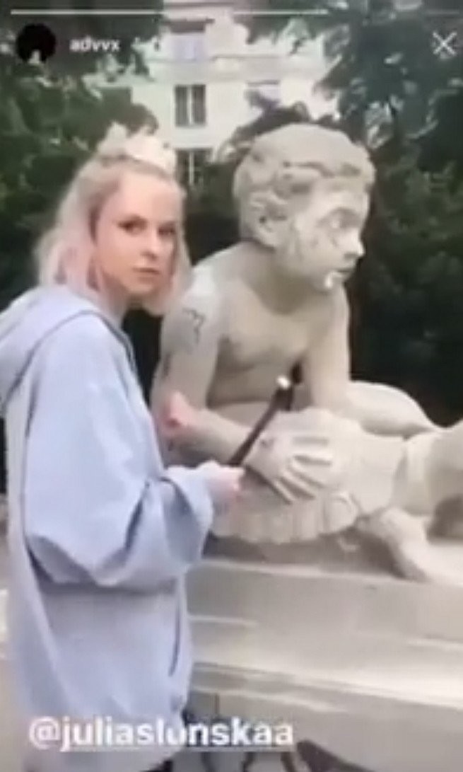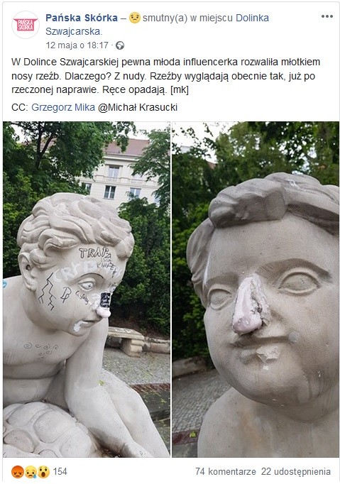 Julia Słońska młotkiem odłupiła nos powojennej rzeźbie aniołka, która znajduje się w warszawskim ogrodzie Dolina Szwajcarska. Zachowania nastolatki nie można nazwać inaczej, niż „głupim”. Poniżej można zobaczyć nagranie wideo z tego wydarzenia (zamieszczone na kanale tubeXD na Youtube):