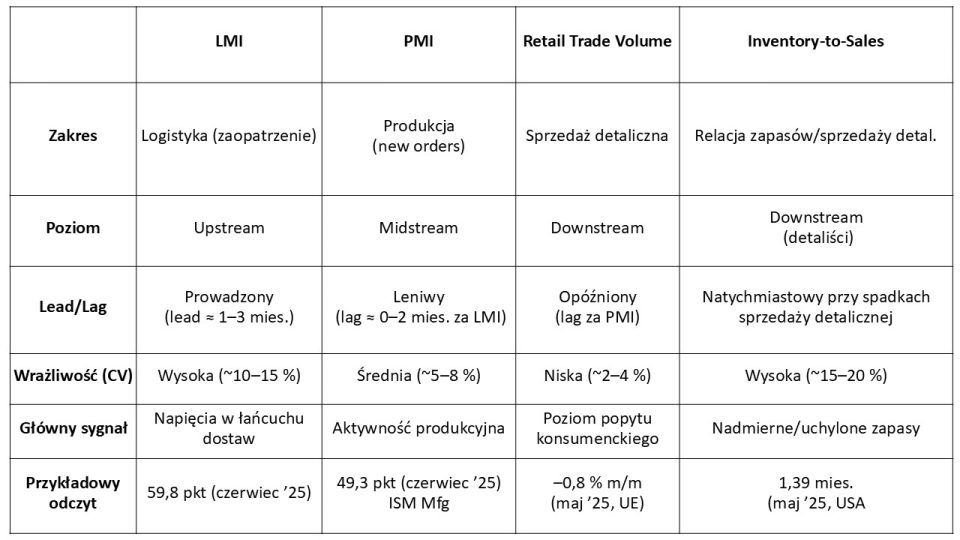 W zależności od tego, na którym etapie analizujemy proces – logistyki, produkcji czy sprzedaży detalicznej – posługujemy się różnymi wskaźnikami. LMI (Logistics Managers’ Index), PMI (Purchasing Managers’ Index) oraz RTVI (Retail Trade Volume Index) dostarczają nam odmiennych sygnałów, które można przypisać odpowiednio do etapów: upstream, midstream i downstream. Czwartym istotnym miernikiem jest Inventory-to-Sales Ratio, który pozwala ocenić, jak długo detaliści mogą utrzymać obecny poziom sprzedaży na podstawie posiadanych zapasów.