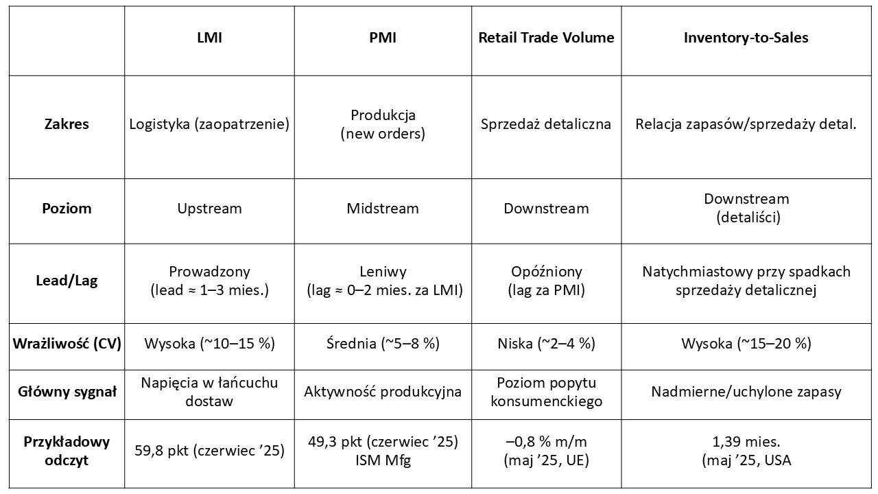 LMI na poziomie 59,8 pkt (czerwiec 2025) wskazuje na wysokie napięcia w logistyce i zapasach. PMI, który spadł do 49,3 pkt (według ISM), sugeruje możliwe spowolnienie produkcji. Z kolei RTVI, który w maju 2025 r. wyniósł –0,8% m/m, sygnalizuje spadający popyt konsumencki. Wskaźnik Inventory-to-Sales Ratio (1,39 miesiąca w USA) pokazuje, że zapasy są relatywnie wysokie, co może oznaczać spowolnienie rotacji i potencjalne przewartościowanie stanów magazynowych. Większość powyższych indeksów składa się z wielu komponentów pomiarowych. We wszystki jednym z kluczowych są w różny sposób ujmowane zapasy.