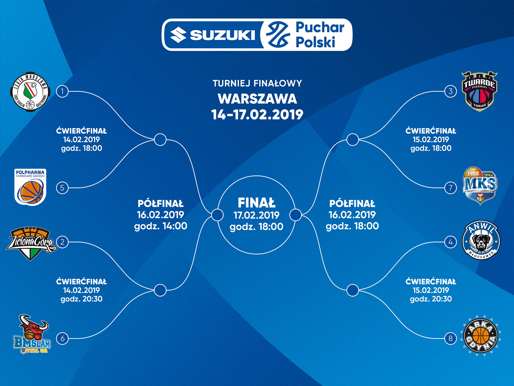 Turniej Finałowy Suzuki Pucharu Polski koszykarzy ponownie zostanie rozegrany w Arenie Ursynów w Warszawie. Osiem czołowych zespołów Energa Basket Ligi od czwartku, 14 lutego 2019 roku do niedzieli, 17 lutego będzie rywalizować o prestiżowe trofeum. Znamy już pary ćwierćfinałowe.