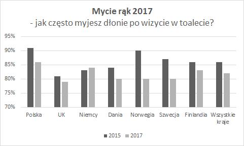 Polacy uplasowali się najwyżej pod względem mycia rąk z wynikiem 86% (w porównaniu do 91% w 2015).
