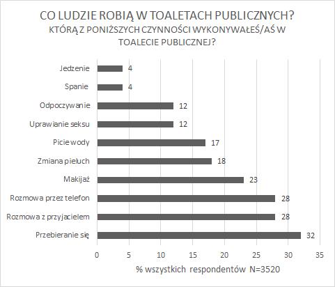 Europejczycy korzystają z toalet publicznych nie tylko w celach oczywistych. Jedna trzecia respondentów korzystała z toalety publicznej, aby przebrać się, 28% odbywało tam rozmowy, a 21% nakładało makijaż. Średnio 12% respondentów idzie do toalety, aby po prostu tam odpocząć.