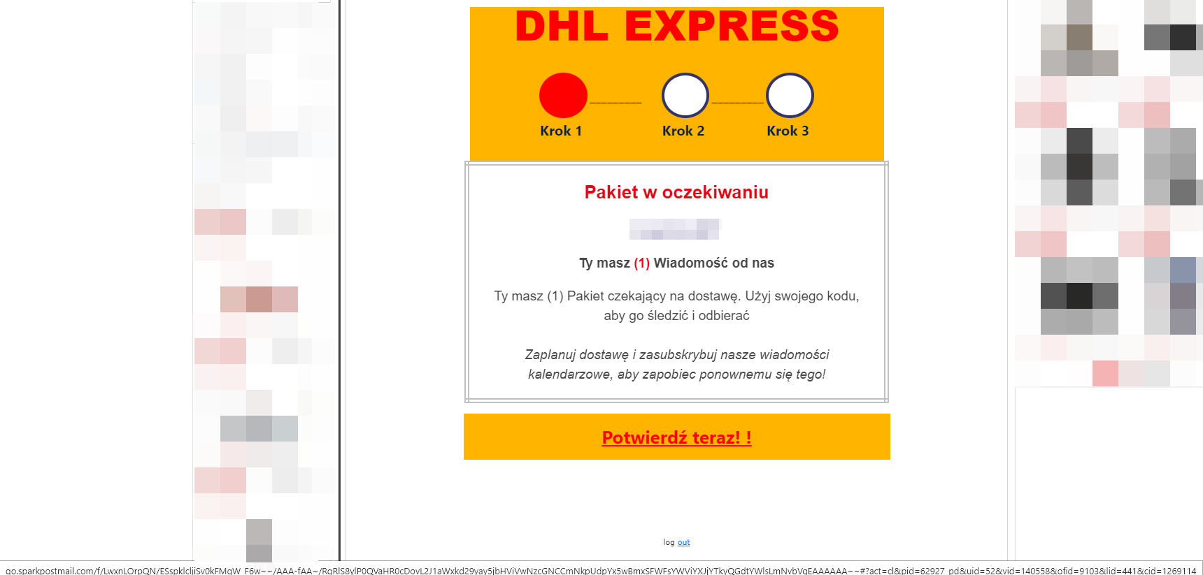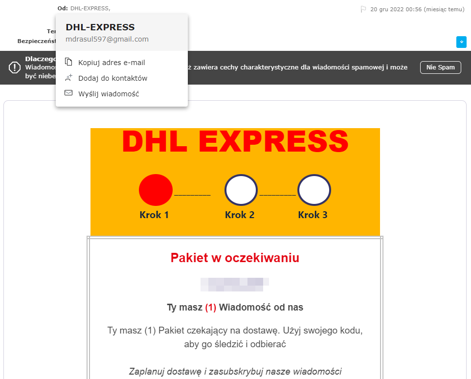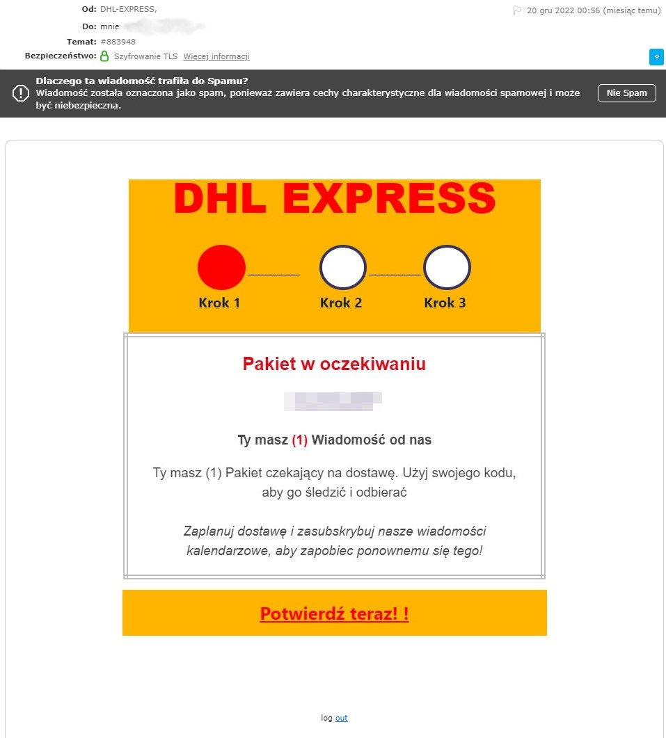 Kolejnym przykładem phishingu, z którym zetknąłem się osobiście było podszywanie się przez cyberprzestępców pod firmę kurierską DHL:
