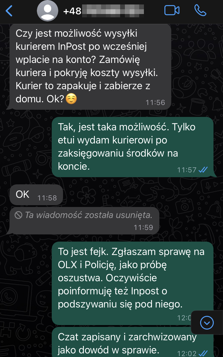 Potencjalny „kupujący” zaczynał zawsze rozmowę od pytania o sprzedawany przedmiot i jego dostępność. Oczywiście od razu zgadzał się na cenę. Oszust zamieszczał wiadomość z linkiem do potwierdzenia płatności za przedmiot i potwierdzającym jego dostawę – w moim przypadku po wykryciu próby oszustwa oszust od razu usunął wiadomość z fałszywym linkiem. Co zyskiwał na tym phisher? Sprzedawaną rzecz, bo otrzymywaliśmy potwierdzenie wpłaty (fikcyjne), więc oszukane osoby wysyłały „zakupione” przez oszustów przedmioty, a dodatkowo przekazywały im swoje poufne dane, w tym dane logowania na swoje konto bankowe, bo tego wymagało sfałszowane potwierdzenie płatności. W moim przypadku oszust od razu usunął wiadomość z fałszywym linkiem po tym jak poinformowałem o zgłoszeniu sprawy serwisowi OLX i na Policję. Przy czym był na tyle bezczelny, aby już po usunięciu wiadomości z linkiem wykłócać się, że ma dobre zamiary i rzeczywiście chce kupić etui na telefon.