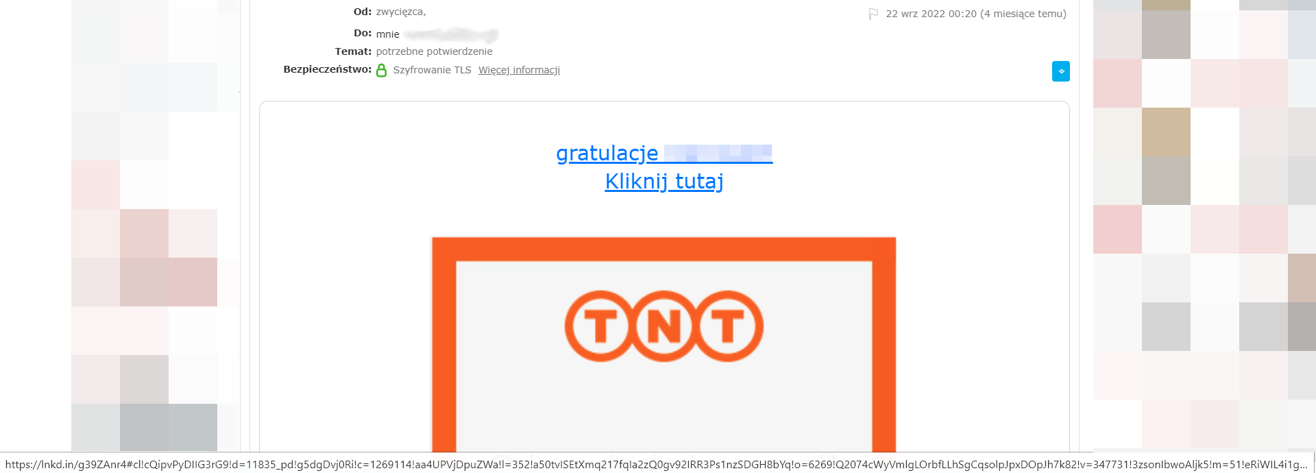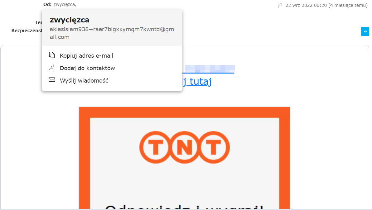 W tej wiadomości jako nadawca wskazywany jest „zwycięzca”. Hmm, dziwne, że tak duża korporacja jak TNT używa nazwy zarezerwowanej dla mnie, bo przecież to ja mam być tym „zwycięzcą”. Więc sprawdźmy jaki adres mailowy kryje się pod nadzwyczaj zwięzłym opisem nadawcy:
