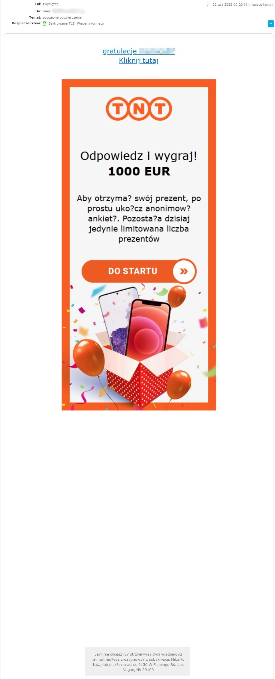 Na powyższym zrzucie ekranu link widoczny jest na samym dole grafiki. Czy kieruje nas na stronę TNT? Oczywiście, że nie! Klikając w ten link jesteśmy przekierowywani na stronę spreparowaną przez hakera. Wchodząc na taką stronę nie otrzymamy żadnej nagrody, tylko będziemy poproszeni o podanie swoich danych – tak wiem, ankieta miała być anonimowa. Zastanawia jak anonimowo moglibyśmy wygrać jakąkolwiek nagrodę. Pomijając ten „drobny” szczegół należy dodać, że kliknięcie w podany przez hakera link może wgrać nam złośliwe oprogramowanie, które zostanie wykorzystane przez hakera w celach niekoniecznie przez nas aprobowanych. Wracając jednak do przedmiotowej wiadomości, w oczy rzuca się fakt stosunkowo niezgrabnie napisanej w języku polskim wiadomości, a w szczególności użytego zwrotu „DO STARTU”. Ponadto znaki zapytania w miejscu typowo polskich liter wskazują, że widomość została przygotowana przez obcokrajowca, który korzystał z tłumacza, a jego komputer nie obsługiwał polskich znaków.