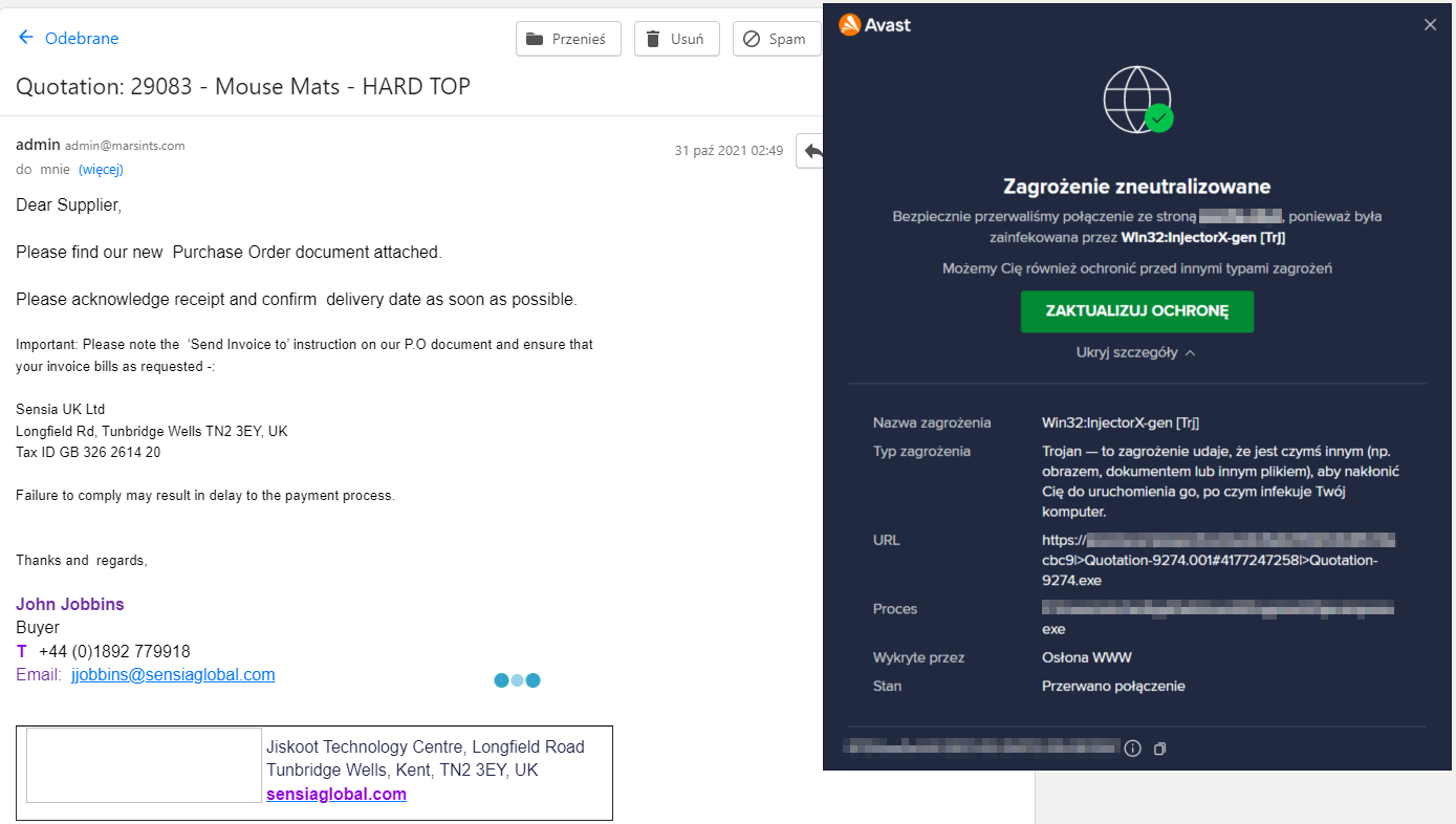 Jednakże powyższe „nieścisłości” mające uwiarygodnić hakera mają stosunkowo niewielkie znaczenie w stosunku do załącznika dołączonego do tej wiadomości, który miał być dokumentem zamówienia. Niestety jest on trojanem, czyli czymś co wydaje się legalne, dobre, ale zawiera złośliwy kod. Samo kliknięcie w szczegółowe informacje o wiadomości zaowocowało takim komunikatem programu antywirusowego: