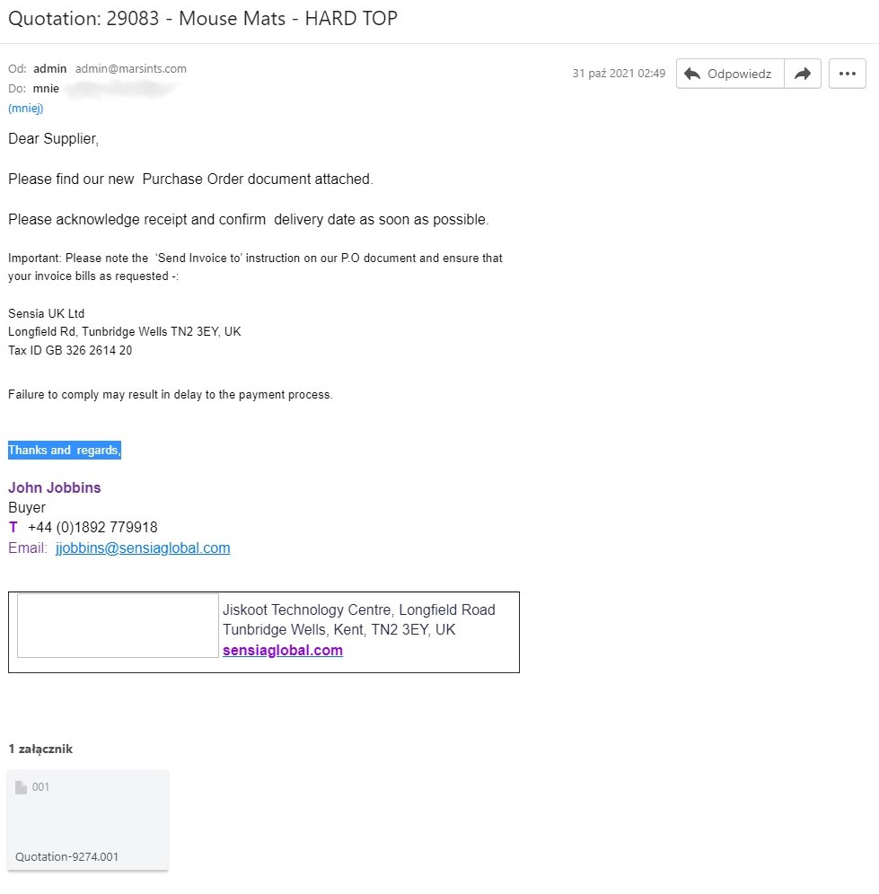 Wiadomość miała być od kupca i dotyczyć dokumentu zamówienia, a ja miałem być potencjalnym dostawcą. Temat wiadomości był zwięzły i niezbyt uważna osoba mogła by pomyśleć, że chodzi o rzeczywiste zamówienie, o ile reprezentowała by producenta podkładek pod myszki komputerowe. Pomijając ten fakt, haker próbuje uwiarygodnić się podając profesjonalny adres email zakończony nazwą domeny firmowej – marsints.com. Zdumienie może budzić fakt, że wiadomość pochodzi od nadawcy admin@marsints.com, ale już „kupiec” w stopce wiadomości użył adresu email: jjobbins@sensiaglobal.com. Czyżby obie firmy były siostrzane lub jedna firma była spółką córką drugiej? Nic bardziej mylnego. Firma Marsints nie istnieje (prawdopodobnie haker próbował poszyć się pod firmę Mars International, posiadającą domenę marsint.com – amerykańskiego producenta sprzętu mechanicznego i elektrycznego).
