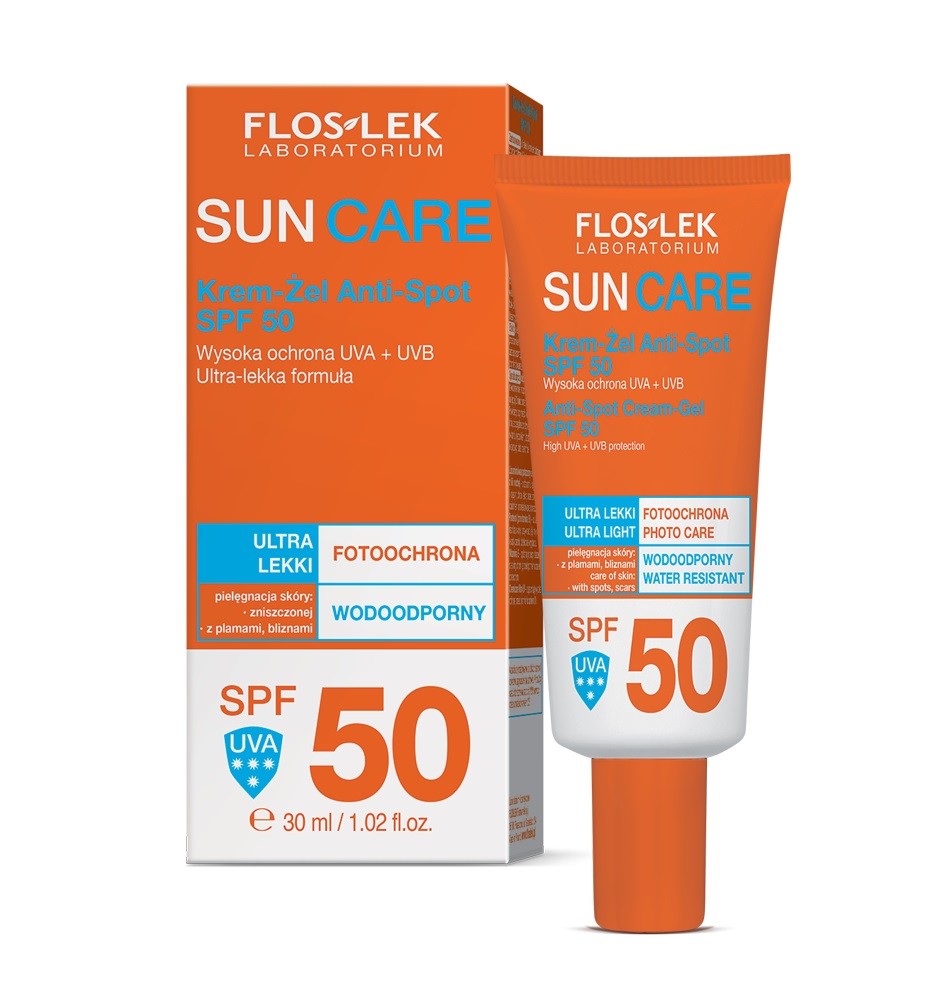 Krem-Żel Anti-Spot SPF 50 do skóry zniszczonej z tendencją do przebarwień zabezpiecza przed przedwczesnym starzeniem skóry, chroni przed nadmierną pigmentacją, minimalizuje powstawanie plam. Jest wodoodporny i potoodporny. Ma ultra-lekką formułę. Zawiera lipoaminokwas połączony z ekstraktem lilii wodnej o działaniu łagodzącym i kojącym. Pantenol skutecznie nawilża skórę oraz przywraca jej miękkość i elastyczność, natomiast witamina E opóźnia procesy starzenia.