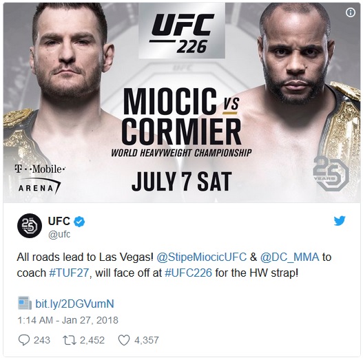 Federacja UFC wstrząsnęła światem MMA, kiedy ogłosiła, że podczas tegorocznej edycji International Fight Week, na gali UFC 226, która odbędzie się 7 lipca, w walce wieczoru zmierzą się ze sobą mistrz wagi ciężkiej Stipe Miocic (18-2 MMA, 12-2 UFC) oraz mistrz wagi półciężkiej Daniel Cormier (20-1 MMA, 9-1 UFC) .